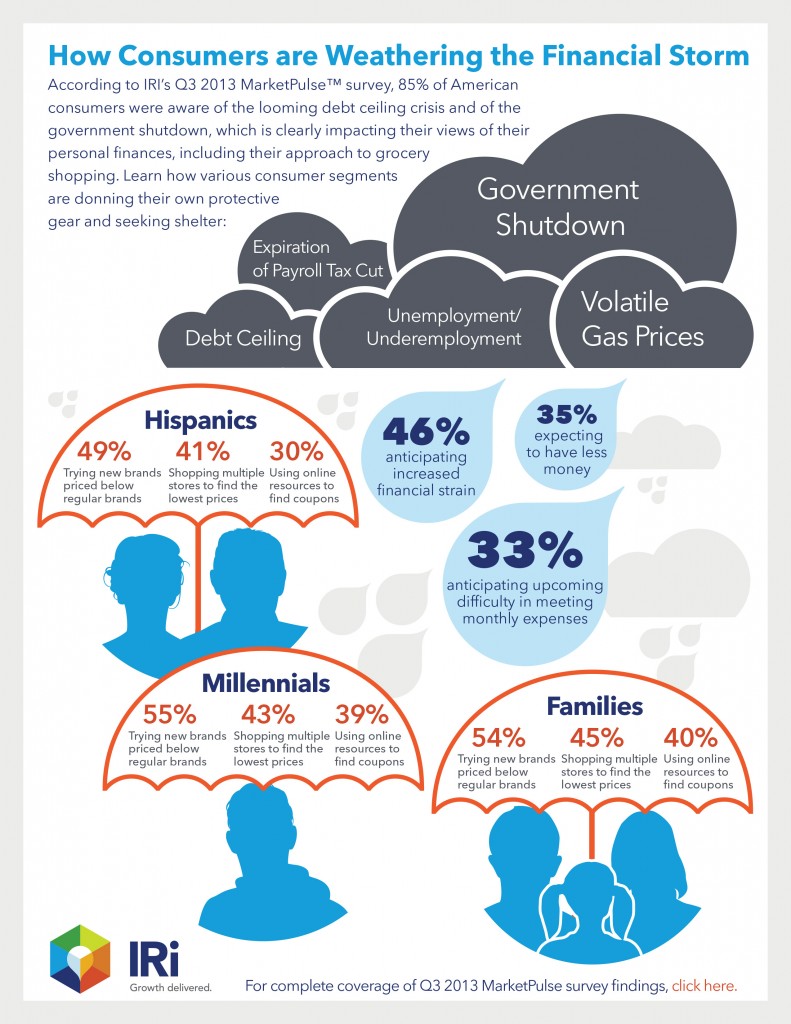 According to IRI's Q3 2013 Marketplus™ survey, 85% of American Consumers were aware of the looming debt ceiling crisis and of the government shutdown, which is clearly impacting their views of their personal finances, including their approach to grocery shopping. Learn how various consumer segments are donning their own protective gear and seeking shelter.